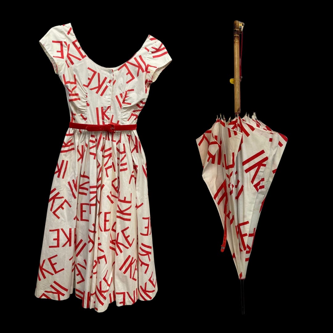During Dwight Eisenhower’s 1956 presidential campaign, thousands of “Ike Girls” donned silk screened dresses in support of his re-election. The dresses featured the popular Dior “New Look” silhouette and kept with the feminine ideal of the time - a cinched waist and a full skirt. These Ike Girls were significant in appealing to female voters, handing out buttons and leaflets and engaging in political campaigning for the Republican.