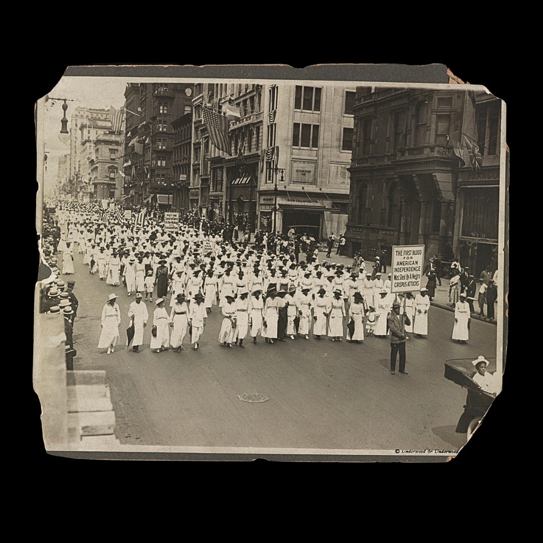 Ready made and mass produced clothing was in its infancy, and the popularity and affordability of white dresses allowed suffragettes to easily use the color to recruit and promote the cause. In 1917, black activists in NYC marched down Fifth Avenue in a silent protest against lynching and racial discrimination. The sea of white linens did more than signal suffrage, the dresses spoke directly against the racism black women endured from a white society. It showed that they were as pure, respectable, and moral as their white peers - something many white suffragettes did not believe at the time.