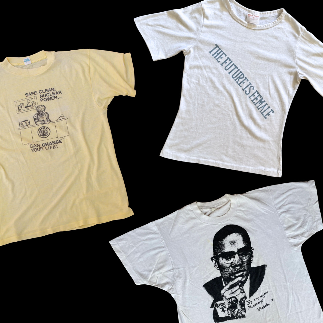The humble tee shirt continues to be one of the most effective and frequently used ways to spread our political ideas with the world, with many of these vintage tees still remaining in circulation for new generations to use as political signifiers.