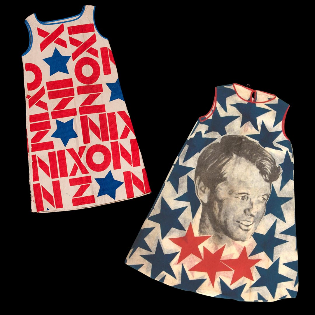 The sixties saw an explosion of fashion used as a medium for subversion, rebellion, identity, and expression - so it is no surprise that various political movements took advantage of the power of dress. Presidential candidates Nixon and Kennedy jumped on the trend of disposable paper dresses to help promote their campaigns to young voters.